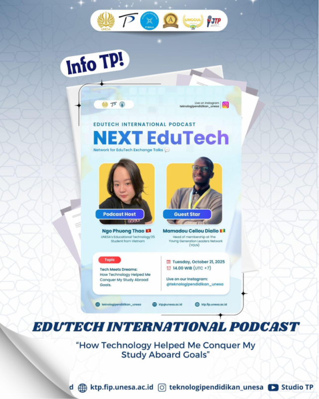Surabaya, UNESA – The Study Program of Educational Technology is currently making a breakthrough in internationalizing its programs to a wider audience. They are presenting an EduTech International Podcast featuring international student speakers, titled “Network for EduTech Exchange Talks” (NEXT). This program is not just an average podcast, but a forum for exchanging valuable knowledge and experiences in the EduTech field. The premiere session of NEXT was held on Tuesday (October 21, 2025) with the theme “Tech Meets Dreams: How Technology Helped Me Achieve My Study Abroad Goal,” presented by Vietnamese student Ngo Phuong Thao, also known as Emilie. Mamadou Cellou Diallo, a guest star from Guinea, joined her. This talk examined the crucial role of EduTech in facilitating international student success and helping them achieve their dreams. Mamadou, who is currently Head of Membership at The Young Global Leaders Network, explained how he navigates the educational opportunities and language barriers in Indonesia through the use of digital tools, despite coming from a country with internet accessibility challenges. “It’s hard in Guinea, since the internet is still a big problem. Not many people have access to the internet,” he said. This KNB Scholarship awardee also shared his experiences with EduTech in daily learning as an international student. “As an international student, we are required to learn Indonesian for 2 semesters before moving to academic. So, when I started learning Indonesian, I used Google Translate a lot. To conquer the challenges, I’m relying on tools and other apps, such as YouTube and Google, to help me out. That’s really important, since I got the scholarship online, and that shows how important technology is–especially EduTech”. As the cherry on top, he also added some advice for the young international students who are chasing their dreams. He mentioned before that he struggled to find all the information and categories; now he’s becoming the pioneer to help everyone who needs it to achieve their goals by opening his own channels and platforms for sharing information. Yet he also reminded the audience to be wise, know what you want and what you have. Writer: Mujahidah Auliya Ihsani (24B)